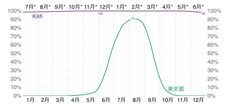 グラフを見るとキリフィ(Kilifi)は年間を通して湿度が高く、蒸し暑いことが分かります。