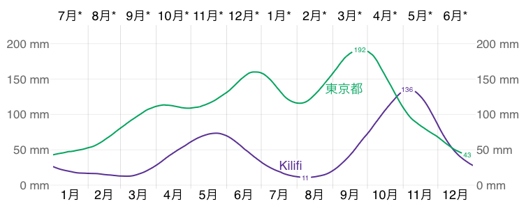 キリフィ(Kilifi)は年間を通して東京より雨量が少ない事が分かります。