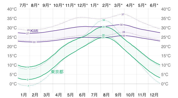 グラフによるとキリフィ(Kilifi)の年間平均気温は22度~32度まで変化します。