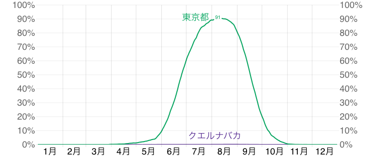降雨量が一番少ない時期は2㎜程度、1番多い時期は152㎜の雨が降ります。
