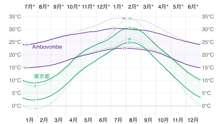 グラフによるとAmbovombe(アンブブンべ)の年間平均気温は15度~34度まで変化します。