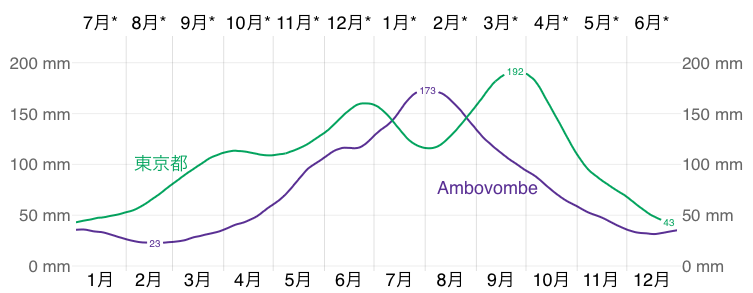 以下のグラフはAmbovombe(アンブブンべ)と日本(東京)の高湿日が何日あるかの比較表です↓