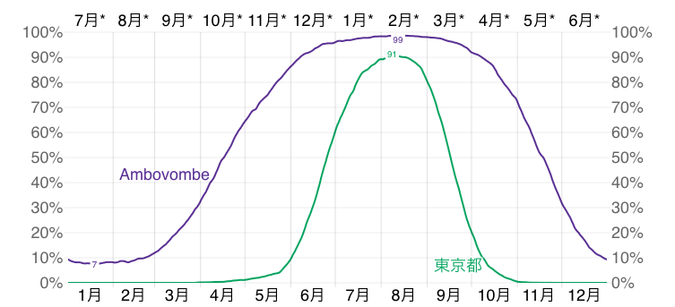 グラフを見ると東京都よりもアンボボンベンシスの自生地周辺都市Ambovombe(アンブブンべ)の方が高湿日の日数が多いことが分かります。
