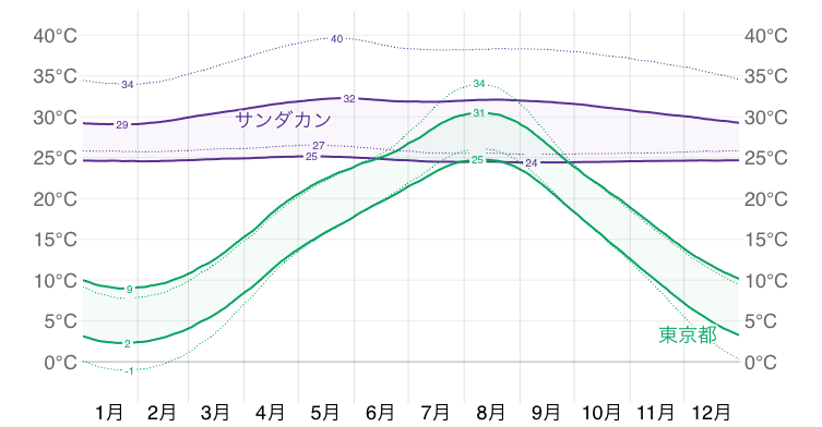 グラフによるとサンダカンは年間を通して暖かく、24度~32度まで変化します。