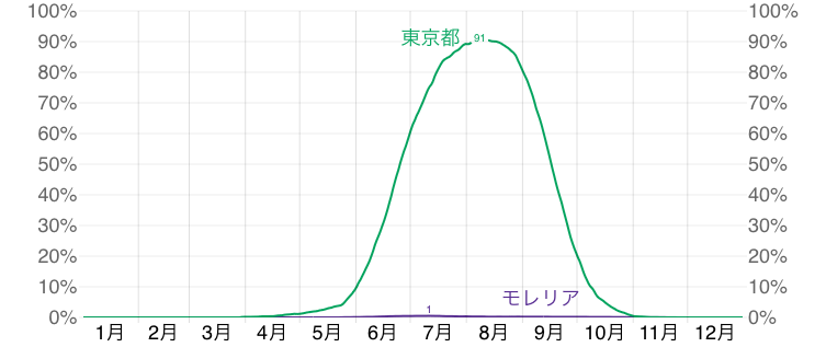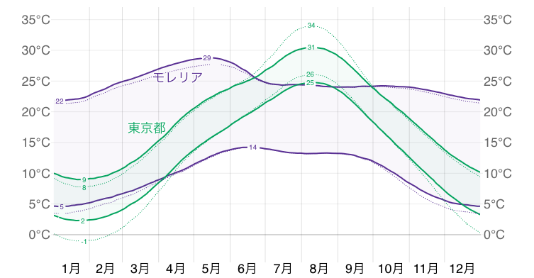 以下のグラフは「モレリア」と「東京」の高湿日(蒸し暑い日)が何日あるかの比較表です↓