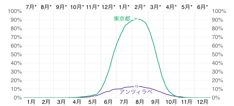 また、日本(東京)とアンツィラベ(Antsirabe)の高湿日が何日あるかの比較表では、アンツィラベ(Antsirabe)は年間を通して高湿日(蒸し暑い日)があまり無い事が分かります。