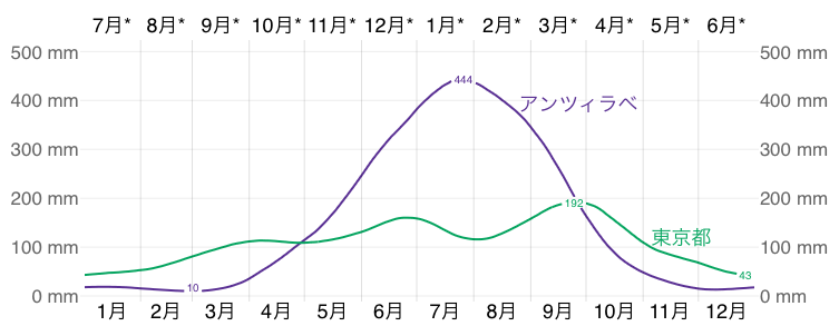 降雨量が一番少ない時期は10㎜程度、一番多い時期は444㎜もの雨が降るようです。