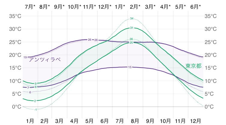 グラフによるとアンツィラベ(Antsirabe)の年間平均気温は6度~26度まで変化し、年間を通して涼しい気候である事が分かります。