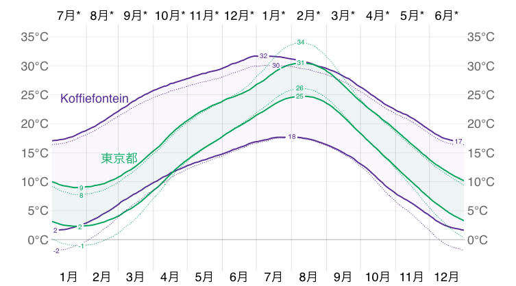 グラフを見るとKoffiefontein(コフィーフォンテイン)は年間を通して蒸し暑くなる日がほぼ無い事が分かります。