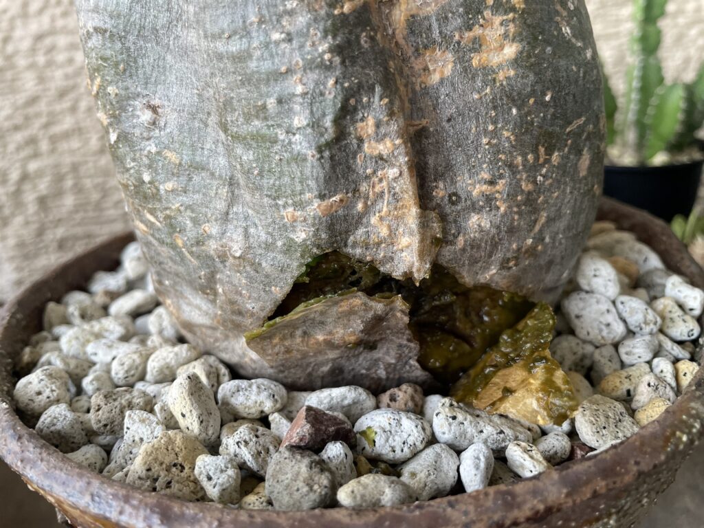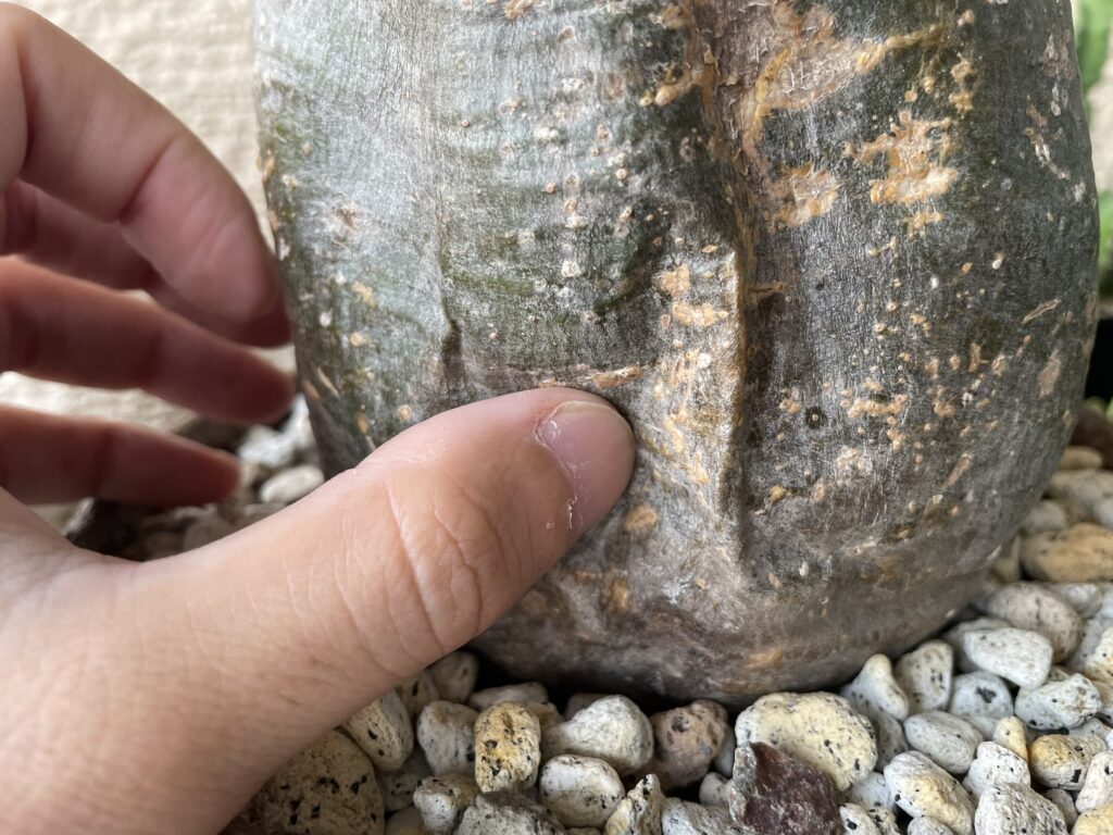 対策:冬越しでグラキリスが凹んでいてもいきなり腰水はせずに、休眠明け直後は少量の水やりを繰り返し、成長が活発になってから腰水管理をした方が良いかも?