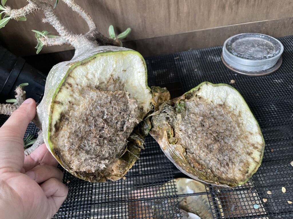 今回のグラキリスが腐って原因として1番有力なのは、根量が少ないのに「大きな鉢」に植え込んで、「鉢に比例した多い用土」に「たっぷりと水やり」をしていた事で思っているよりもずっと用土の乾きが遅く、いつまでも用土の中まで乾き切らず、それに気づかずに他のグラキリスと同じように水やりをしてしまったことによる「根腐れからの菌による腐敗」だと思います。