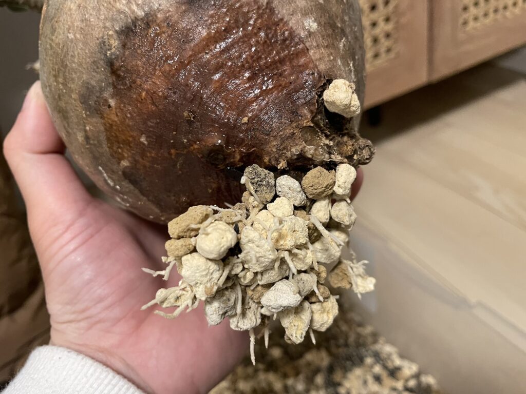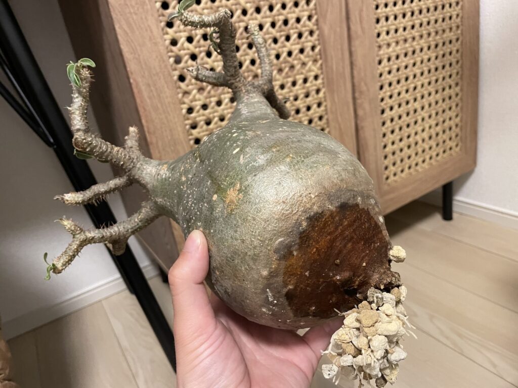 用土と根はカラカラに乾いているのに、グラキリスの下部の1部だけが湿っている