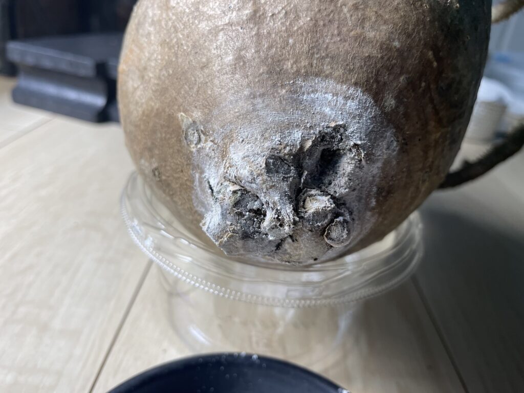 凹み部分をハサミで少し切ってみると思いっきり腐りが入っている。