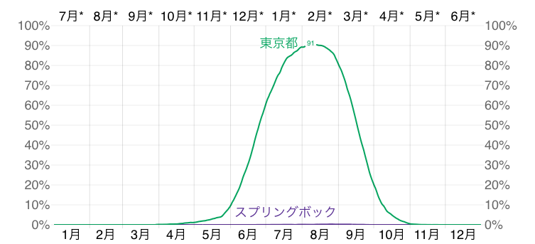 グラフを見るとスプリングボックは年間を通して蒸し暑くなる日がほぼ無い事が分かります。