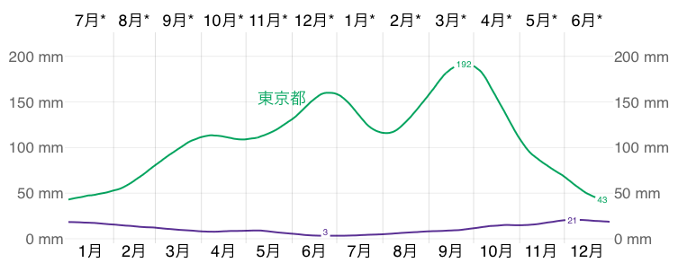 降雨量が一番少ない時期は3㎜程度、1番多い時期でも21㎜程度しか降りません。