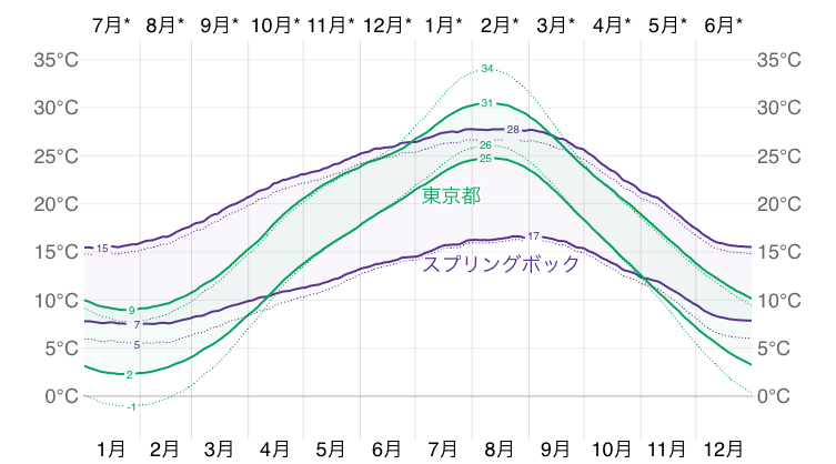 グラフによると(スプリングボック)の気温は年間で7度~28度まで変化します。