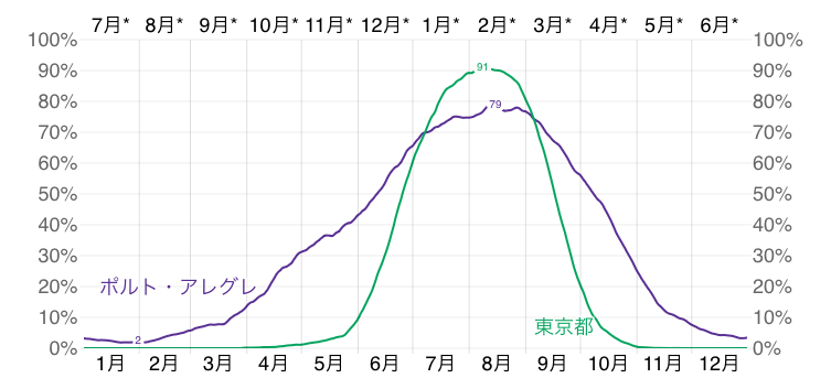 以下のグラフは日本(東京)とブラジル南部(ポルト・アレグレ)の高湿日が何日あるかの比較表です↓