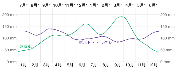 意外にもポルト・アレグレは年間を通して降雨量が多く、1番少ない時期でも84㎜程度、多い時期は140㎜もの雨が降ります。