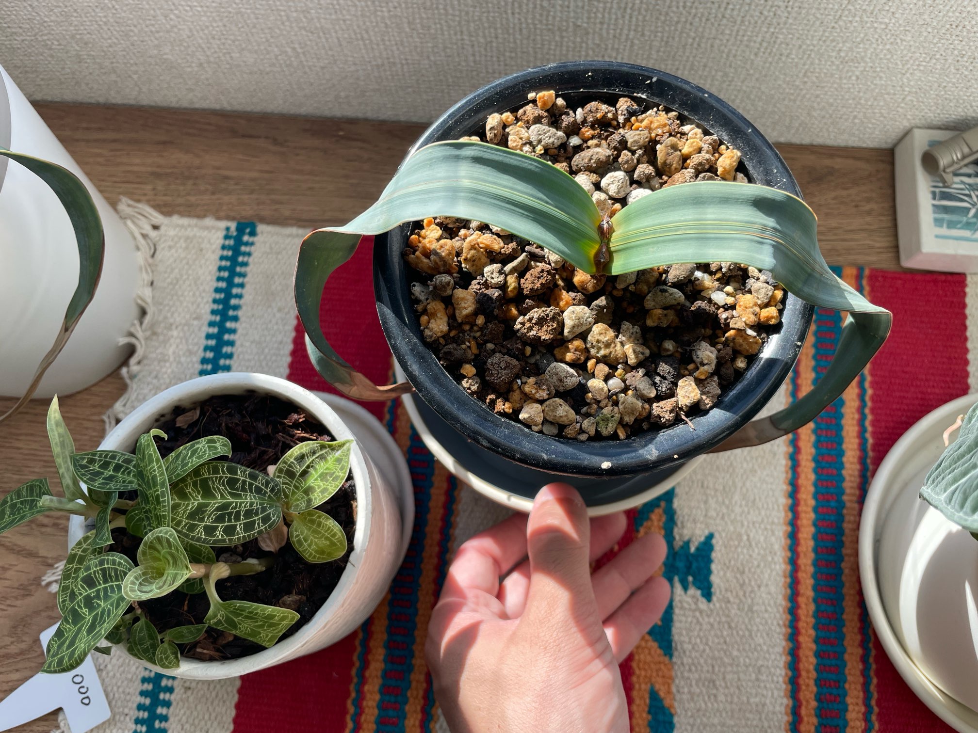 また、奇想天外が小さいうちは植え替え中に根が乾燥してしまわないように水に浸けてあげましょう↓
