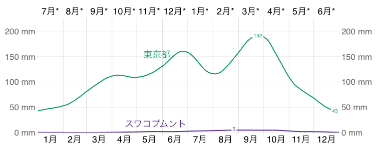 降雨量が一番少ない時期は0〜1㎜程度、1番多い時期でも5㎜程度しか降りません。