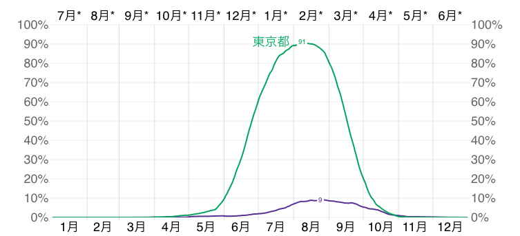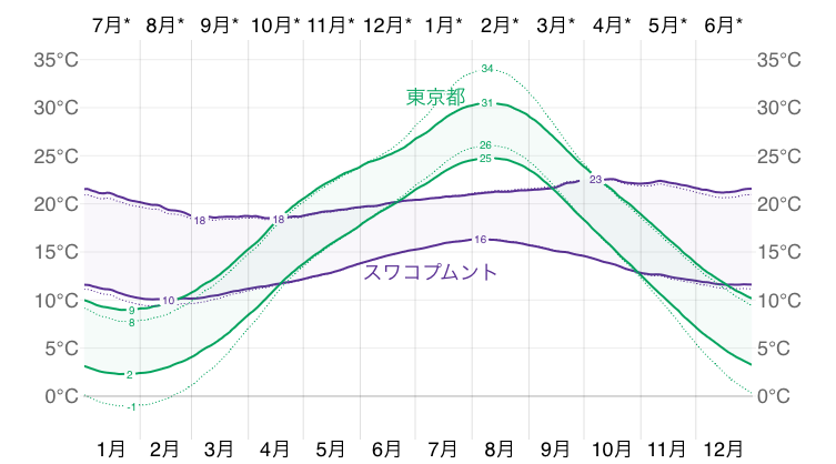 スワコプムントは日本(東京)と比べると蒸し暑くなる日がほとんど無いことが分かります。