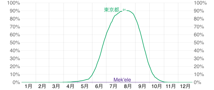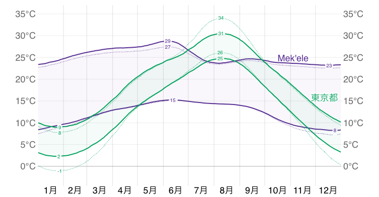グラフを見るとMek’ele(メケレ)は年間を通して蒸し暑くなる日がほぼ無い事が分かります。