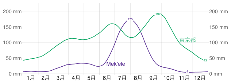 参考程度にマカレンシスの自生地周辺都市、Mek’ele(メケレ)の年間降雨量を見ておきましょう↓