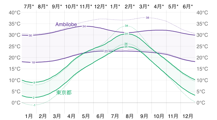 グラフによるとアンビロベ(Ambilobe)の年間平均気温は18度~34度まで変化します。