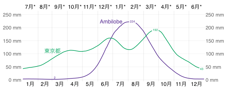 グラフを見ると東京都よりもパキポディオイデスの自生地周辺都市Ambilobe(アンビロベ)の方が高湿日の日数が多いことが分かります。