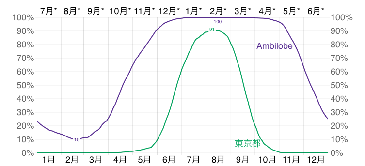 以下のグラフはAmbilobe(アンビロベ)と日本(東京)の高湿日が何日あるかの比較表です↓