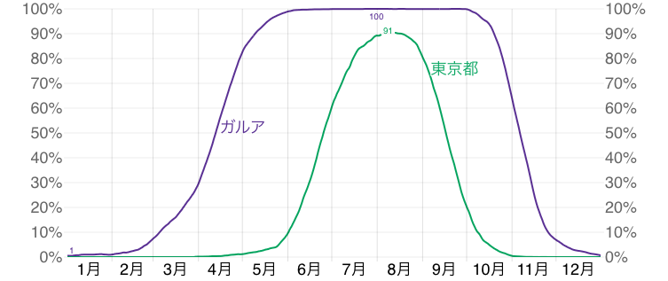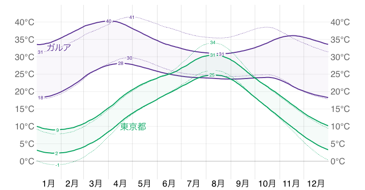 以下のグラフはGaroua(ガルア)と日本(東京)の高湿日が何日あるかの比較表です↓