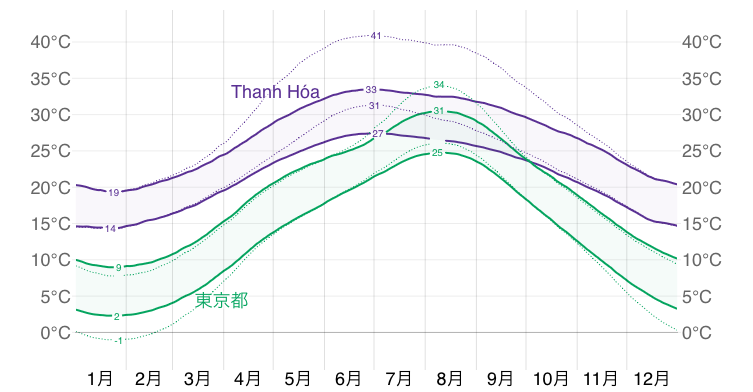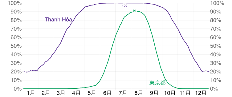 グラフを見ると、Thanh Hóa(タインホア)は東京に比べて高湿日(蒸し暑い日)が多いことが分かります。