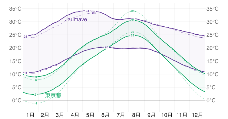 グラフによるとJaumave(ハウマベ)の年間平均気温は11度~34度まで変化します。