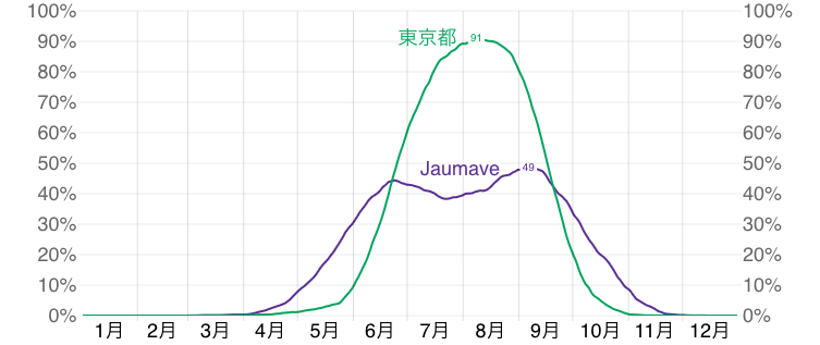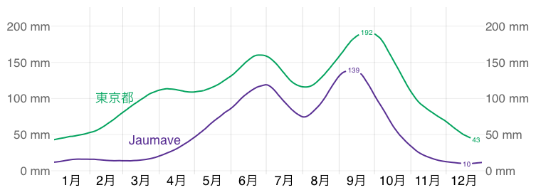 Jaumave(ハウマベ)年間降雨量のグラフの形が日本(東京)のグラフと似ていることが分かります。