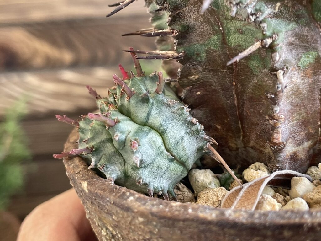 ユーフォルビア・ホリダは株のサイズが大きくなってくると根元から子株を生やします。